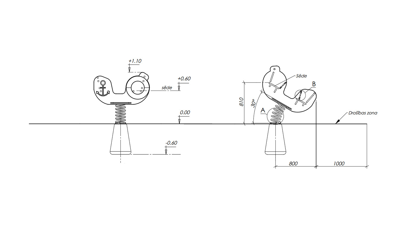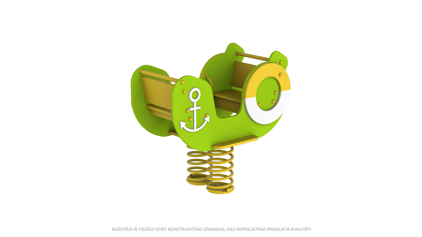 Iekārta paredzēta 2 bērniem vecumā no 2 līdz 7 gadiem. Karkass kuģa formā. Pamatnē divas cinkotas atsperes ar betonējamo enkuru.