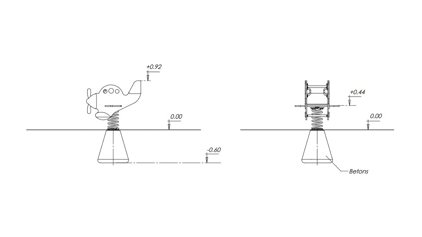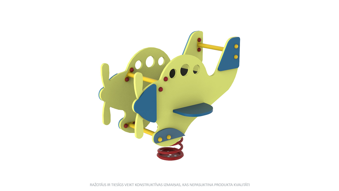 Iekārta paredzēta 1 bērnam vecumā no 2 līdz 7 gadiem. Karkass lidmašīnas formā. Pamatnē cinkota atspere ar betonējamo enkuru.