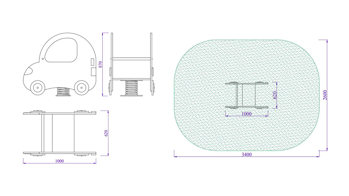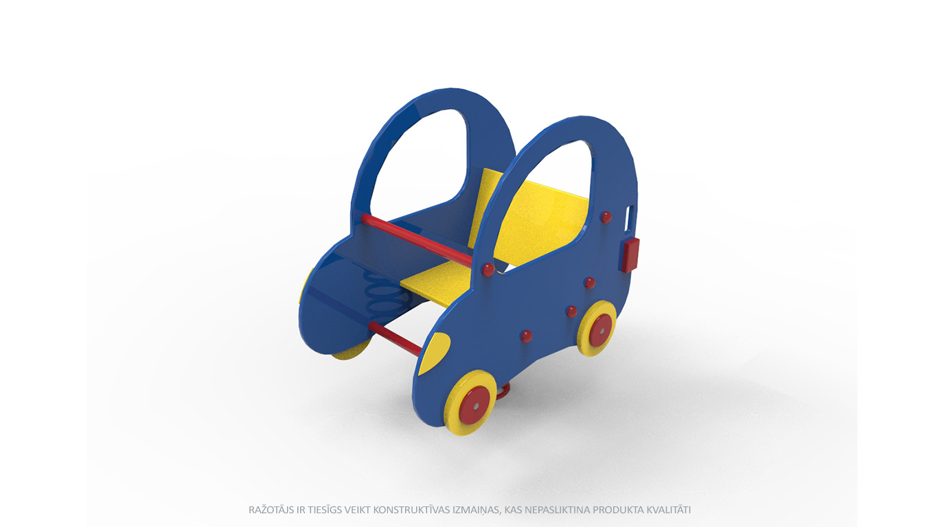 Iekārta paredzēta 1 bērnam vecumā no 2 līdz 7 gadiem. Karkass mašīnas formā. Pamatnē cinkota atspere ar betonējamo enkuru.