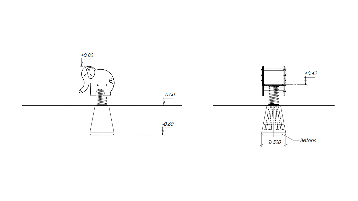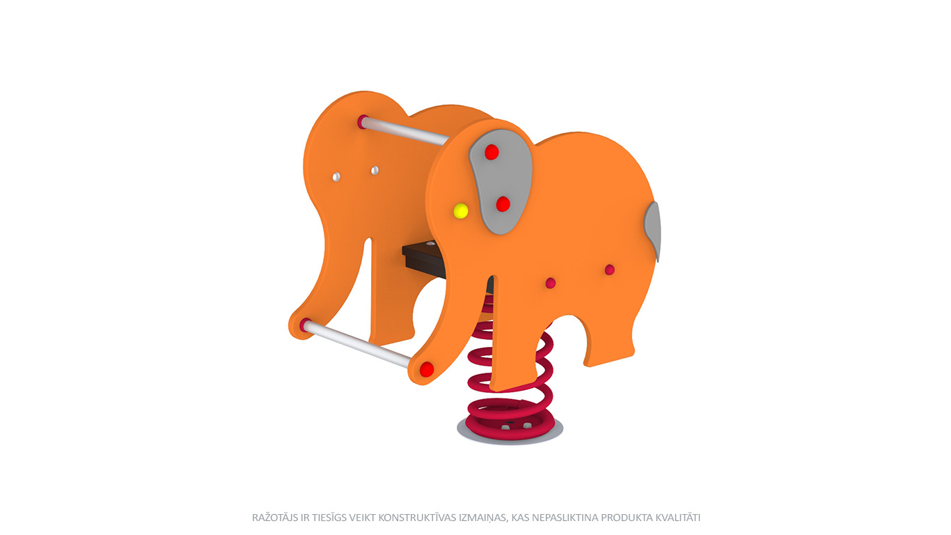 Iekārta paredzēta 1 bērnam vecumā no 2 līdz 7 gadiem. Karkass zilonīša formā. Pamatnē cinkota atspere ar betonējamo enkuru.