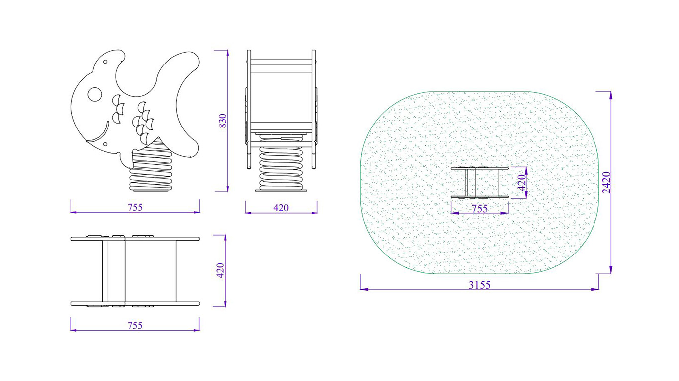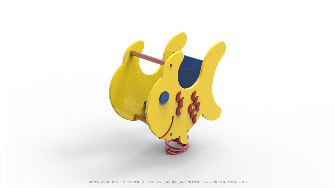 Iekārta paredzēta 1 bērnam vecumā no 2 līdz 7 gadiem. Karkass zivtiņas formā. Pamatnē cinkota atspere ar betonējamo enkuru.